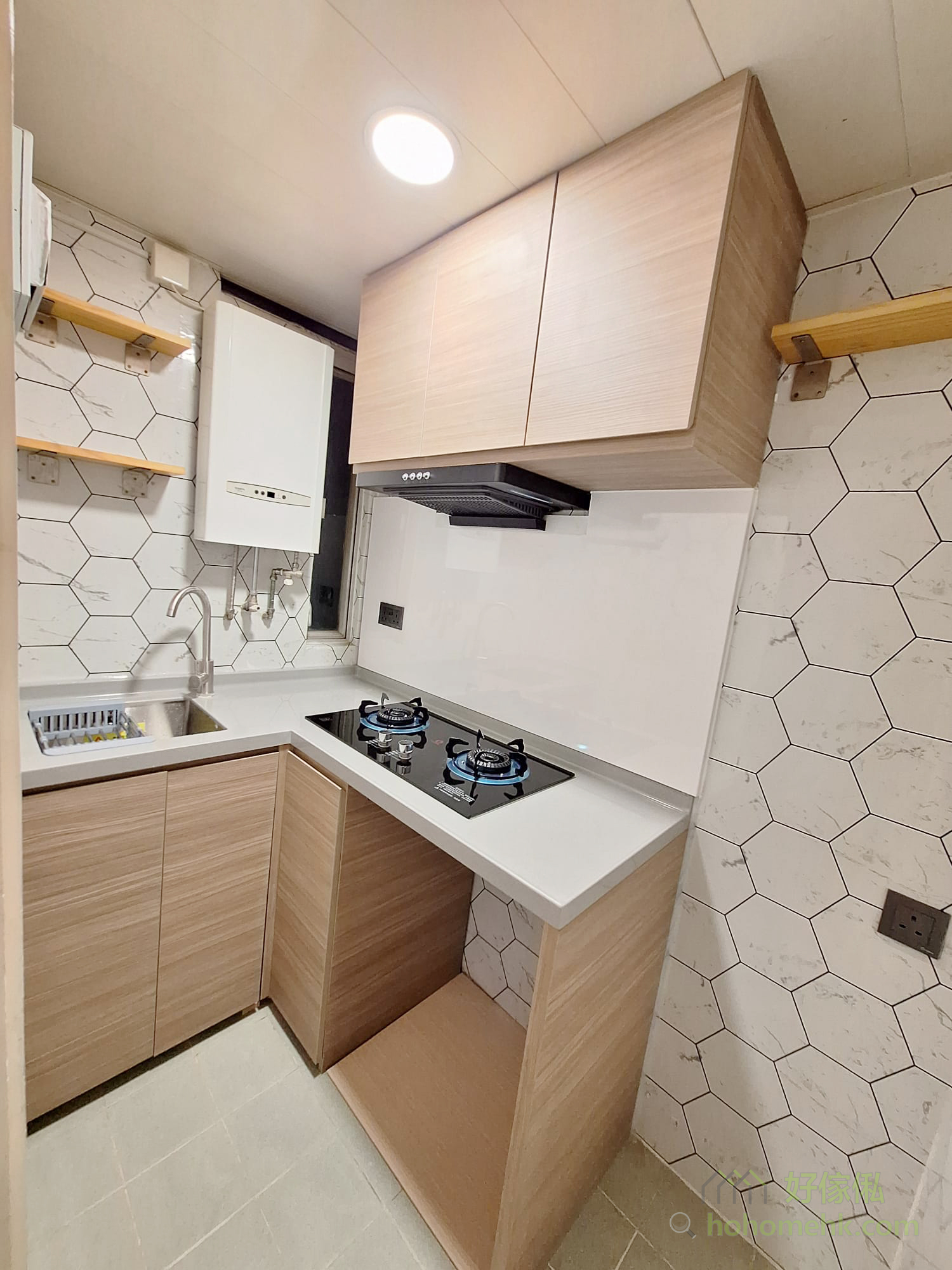 The kitchen furniture features a full wood-grain cabinet body and a grayish-white countertop stone, which echoes the color scheme of the living room and enhances the overall sense of unity. The design of the kitchen cabinets is simple and elegant, with ample storage space, making the cooking area neater and more orderly. The durable stone countertop is solid in texture, easy to clean, and both practical and aesthetically pleasing.