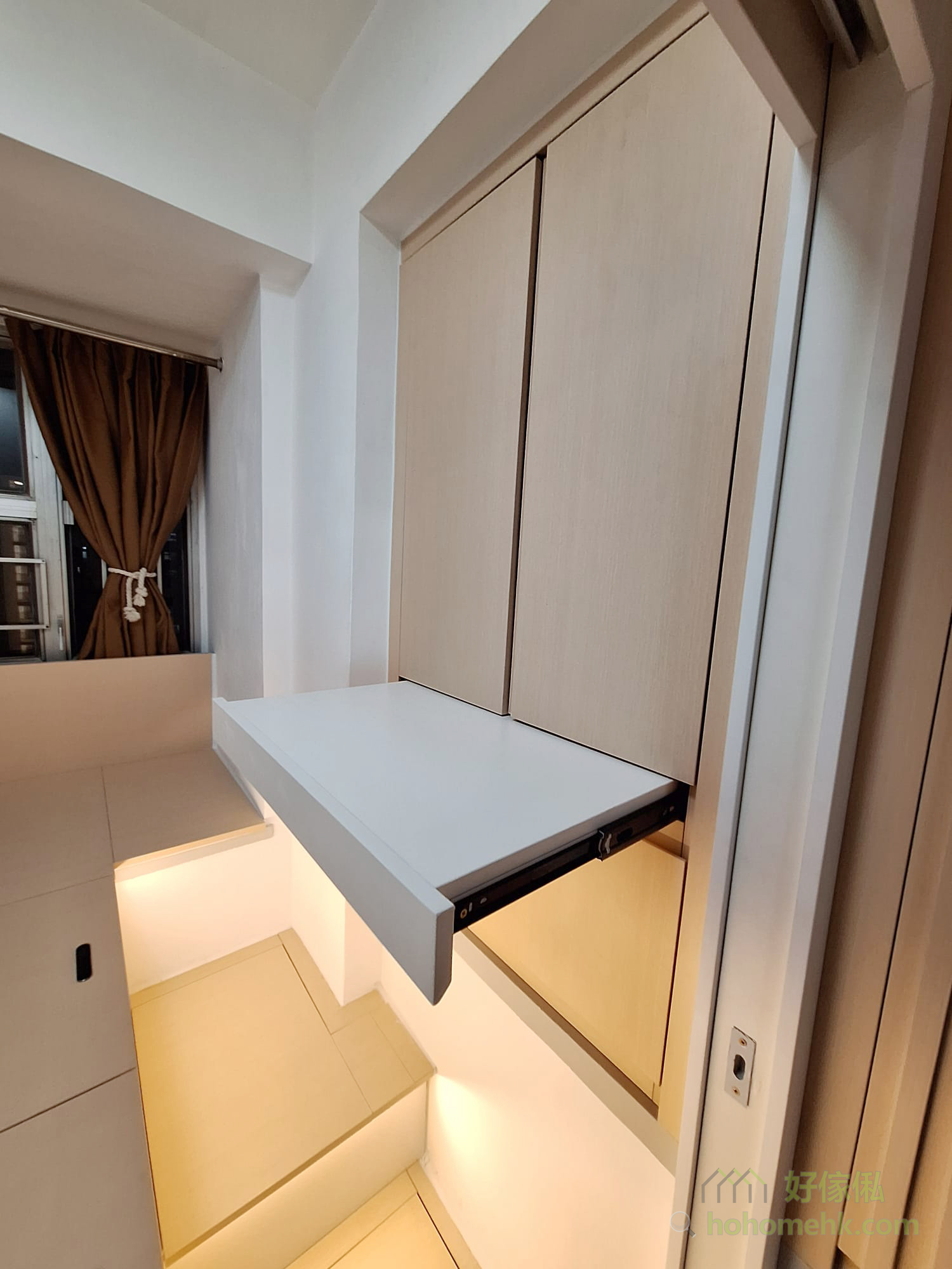 There is a small pull-out table hidden inside the wardrobe, which is simple yet practical and can be used as a dressing table or a folding table. This hidden design not only doesn’t take up much space but also enhances the flexibility of the furniture, fully meeting the daily life needs and bringing more convenience to small-sized apartment residents.