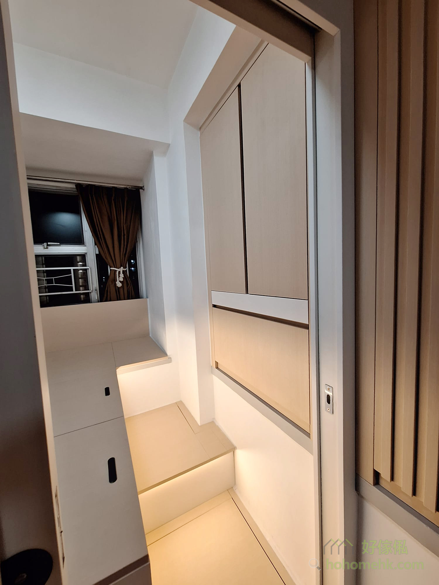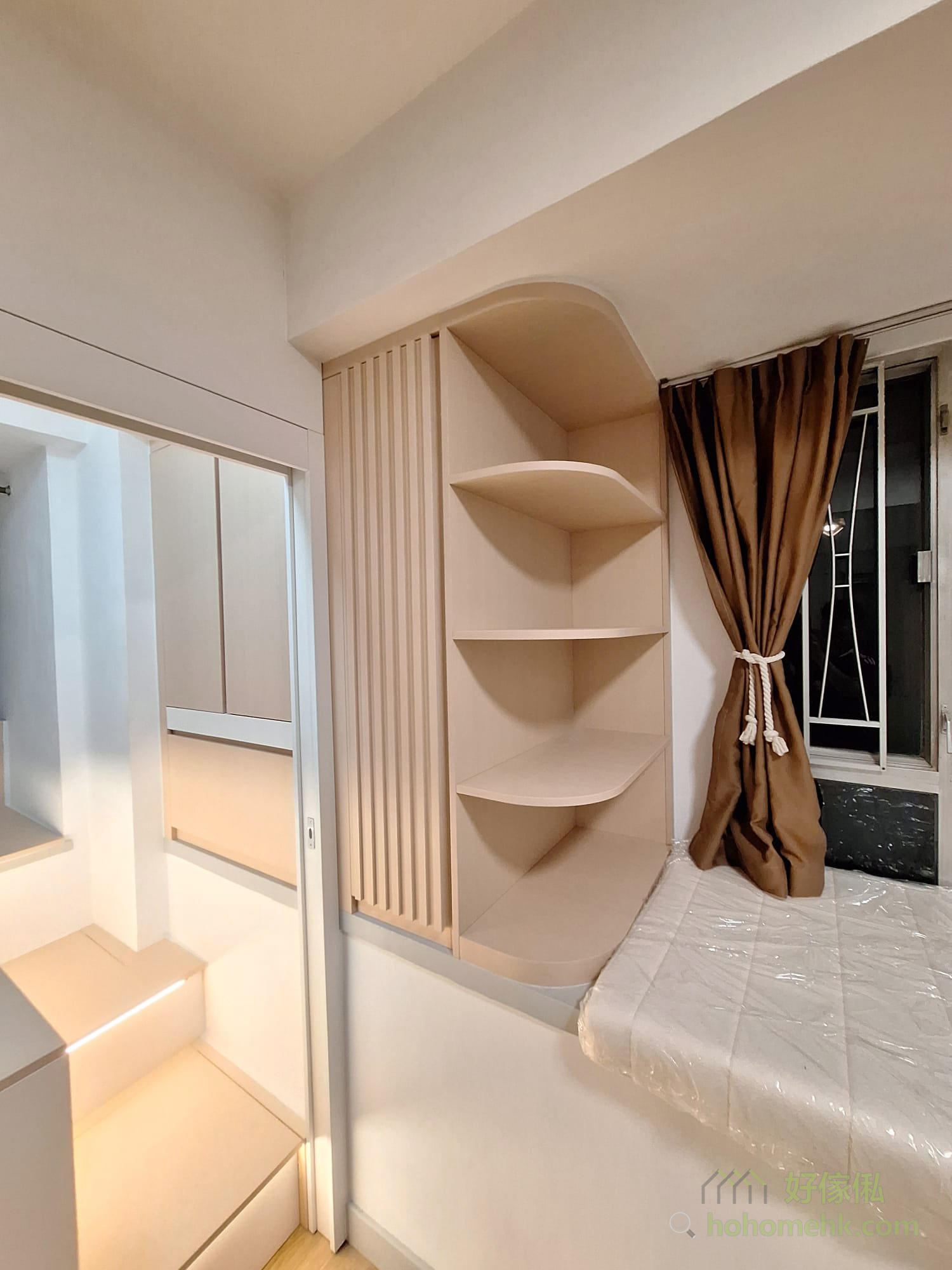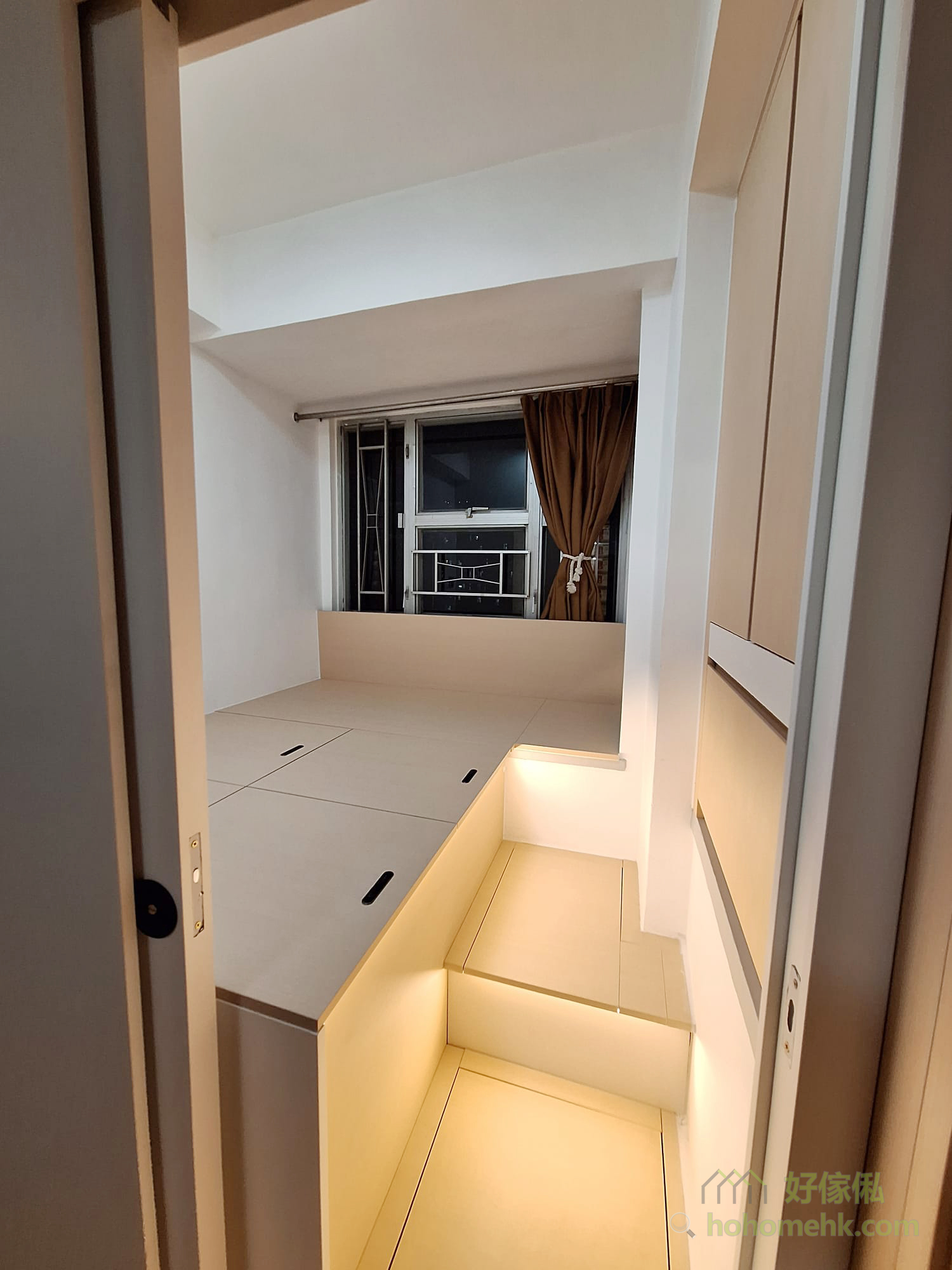 The full floor table design of the bedroom not only provides an extremely large storage capacity but also makes the room look neater and more organized. Each storage compartment on the platform can be flexibly arranged for storage, facilitating classification and organization, and making full use of the limited space. In addition, wardrobes designed with sliding doors are more practical and perfectly match the floor platform, achieving a dual unity of visual appeal and functionality.