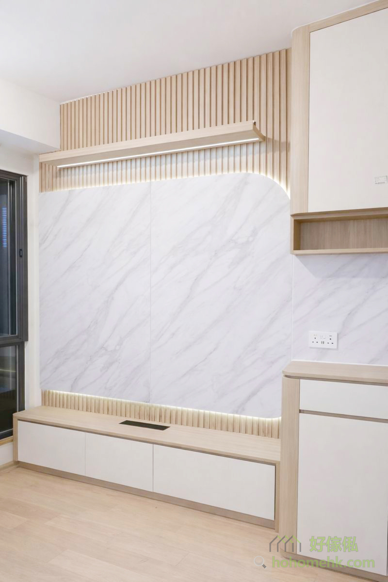 The background wall of the TV cabinet in this case adopts a double-layer design. The bottom layer is a light wood-colored striped wall, while the top layer is decorated with white marble patterned boards, adding a visual layering to the space. The interior is specially designed with a function to hide wires, which not only enhances the overall aesthetic appeal but also facilitates future organization, truly achieving a combination of functionality and appearance.