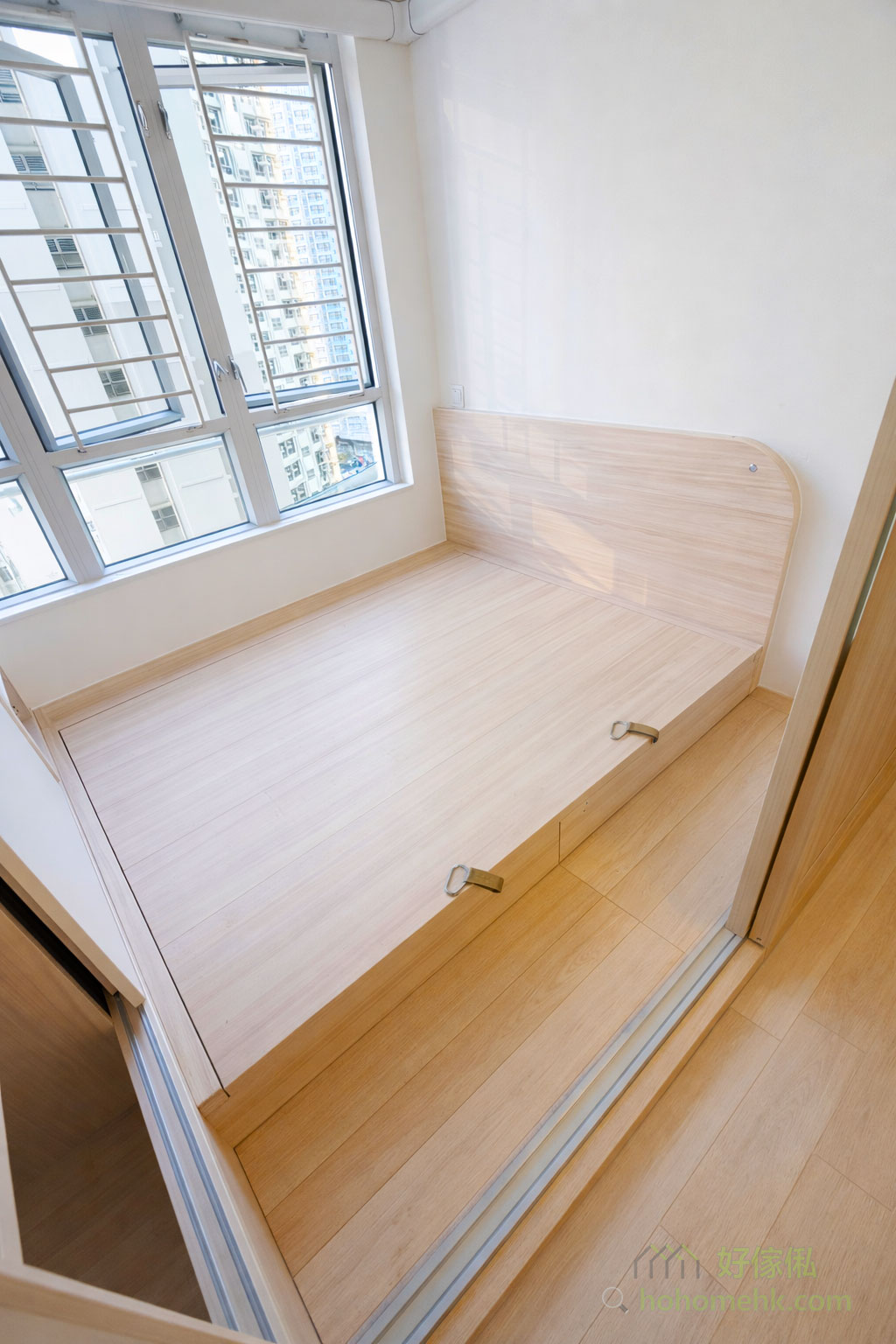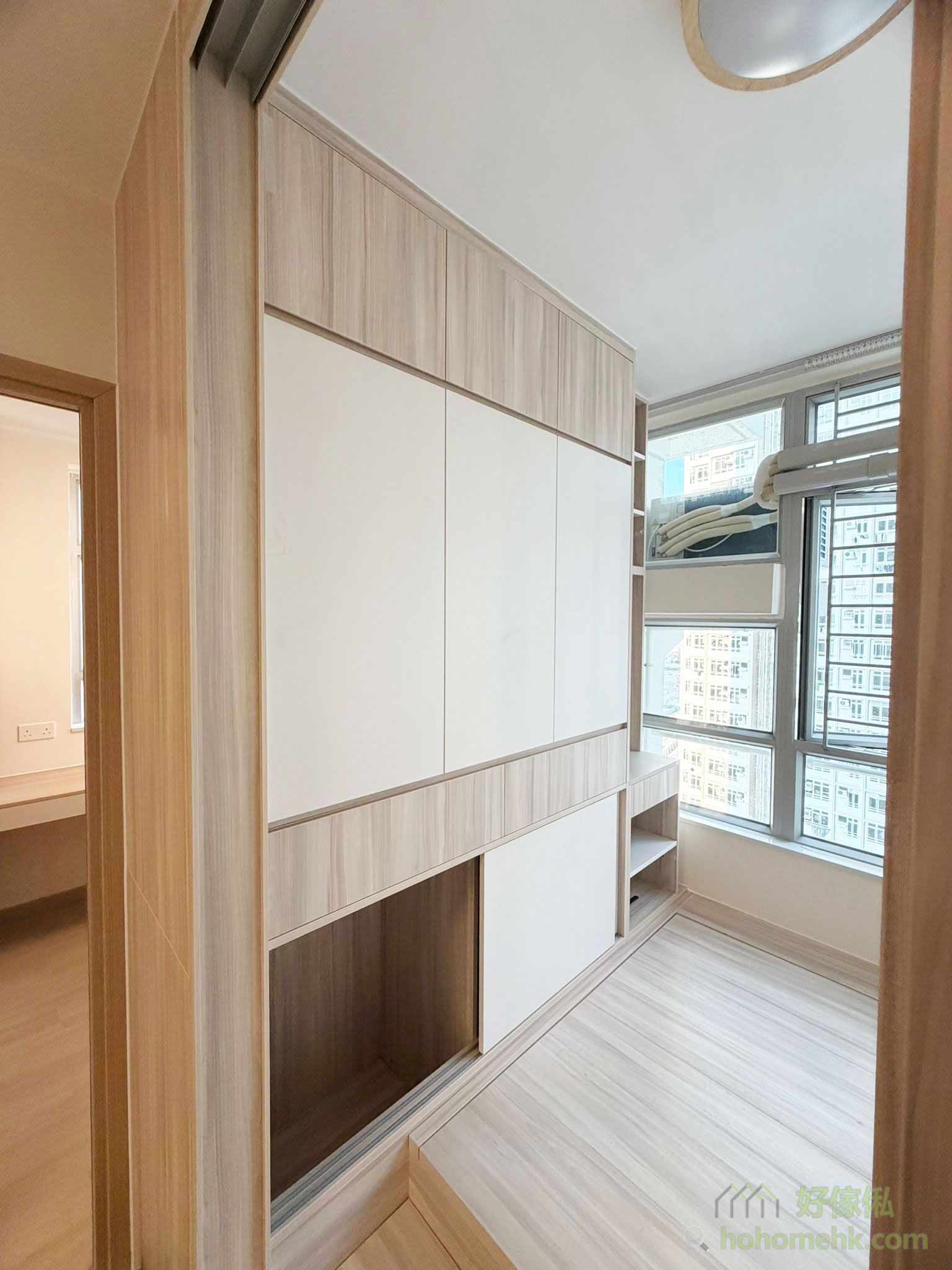 In the design of public housing or Home Ownership Scheme flats, sometimes if one wants to have an extra room, the living room does not have Windows. Therefore, maintaining the light transmission of the living room while also taking privacy into account becomes a major challenge. We designed a Japanese-style sliding door for our client. The upper part is made of frosted glass with a wooden frame, while the lower part is made of wood boards, allowing natural light to penetrate and bringing a bright feeling to the living room. At the same time, it retains the privacy of the room, achieving a balance between practicality and aesthetics.In the design of public housing or Home Ownership Scheme flats, sometimes if one wants to have an extra room, the living room does not have Windows. Therefore, maintaining the light transmission of the living room while also taking privacy into account becomes a major challenge.