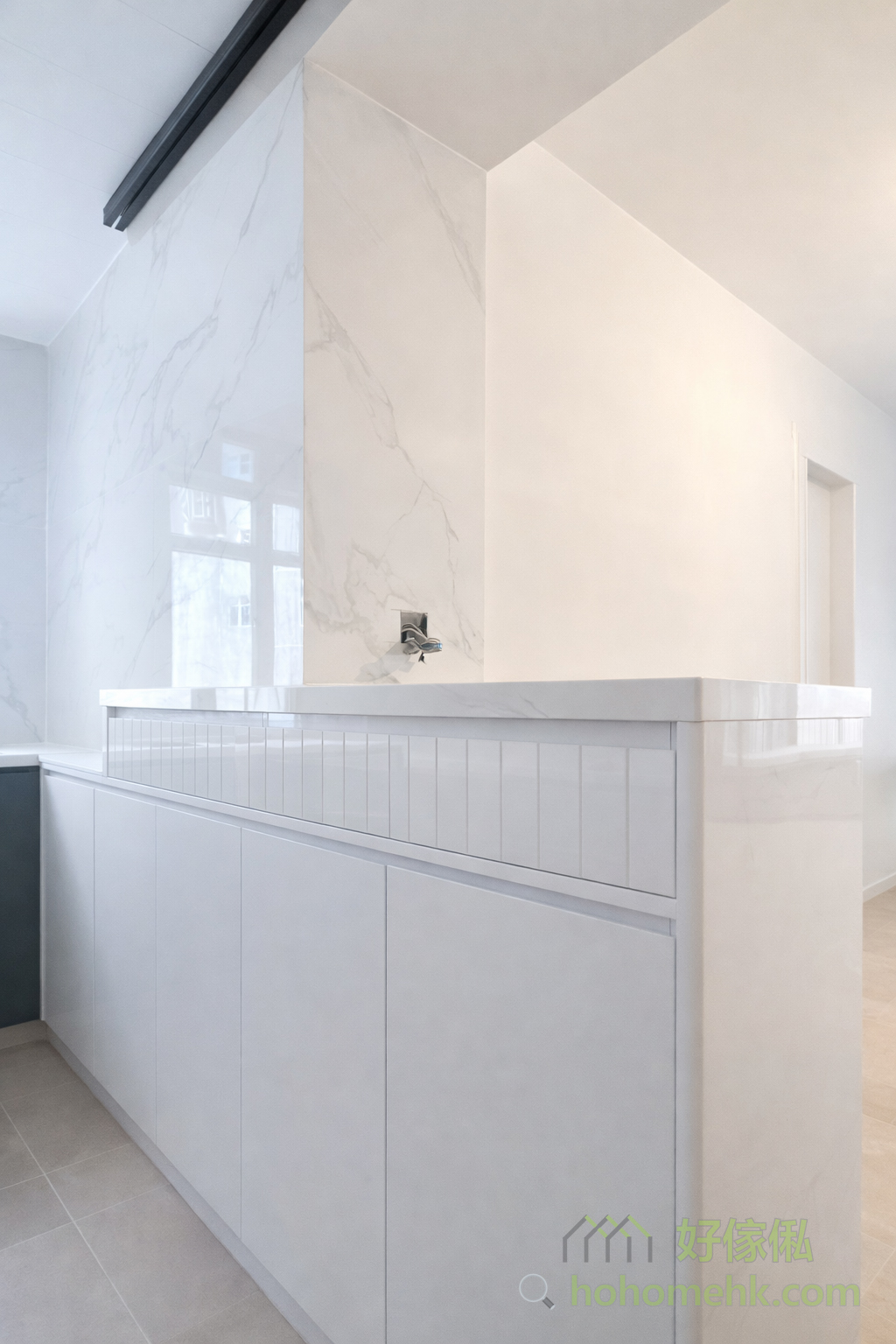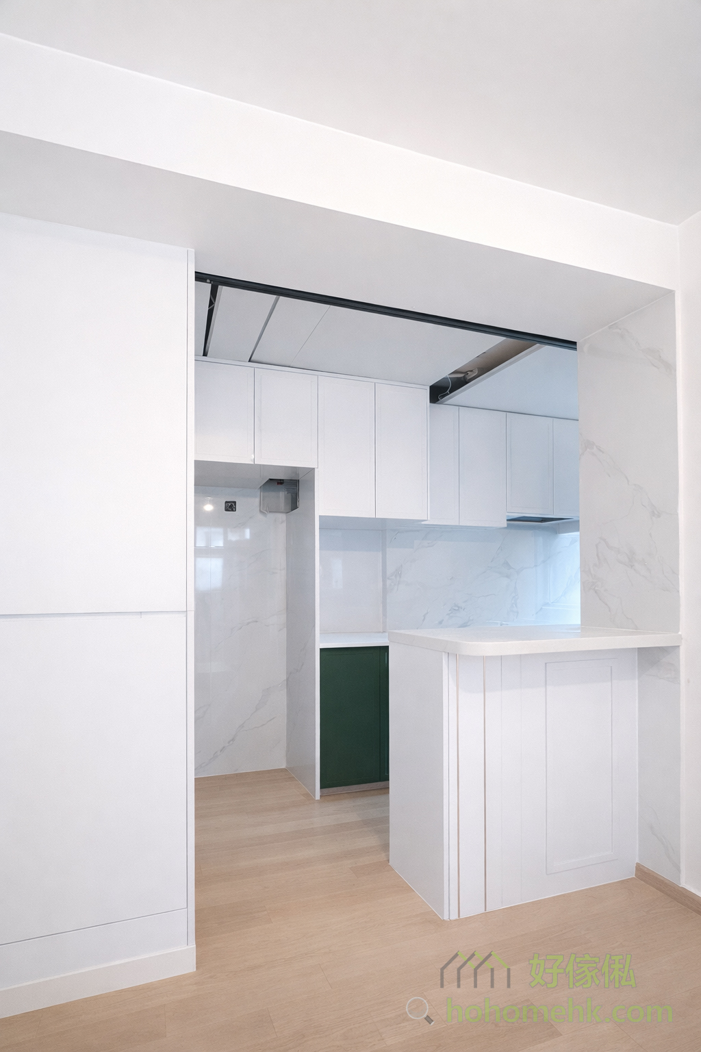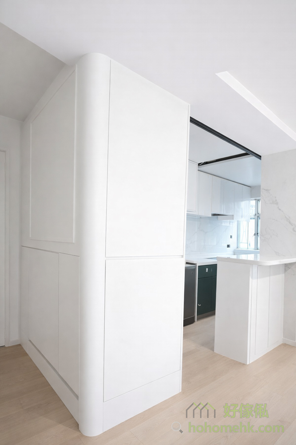 Between the kitchen and the entrance hall, a worker bed cabinet is set up as a partition, which not only provides a comfortable rest space for the worker sisters but also saves the construction cost of wall tiles, making full use of every inch of space. This design is practical and flexible, perfectly meeting the needs of Hong Kong families. The pure white color selection also echoes the furniture style of the kitchen and living room.Between the kitchen and the entrance hall, a worker bed cabinet is set up as a partition, which not only provides a comfortable rest space for the worker sisters but also saves the construction cost of wall tiles, making full use of every inch of space. This design is practical and flexible, perfectly meeting the needs of Hong Kong families. The pure white color selection also echoes the furniture style of the kitchen and living room.