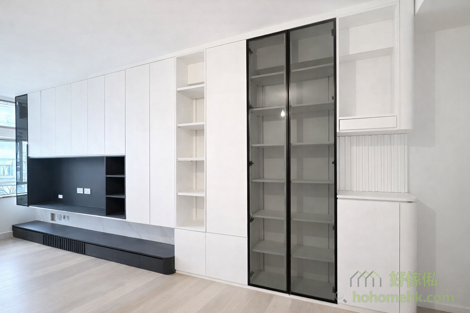 The living room is mainly in white, complemented by a few glass cabinets and dark grey base cabinets. The overall design is simple yet retains a sense of layering. The white color enhances the sense of space, while the accents of dark grey and glass materials add a modern touch to the space, making the living room a comfortable area for the whole family to share.The living room is mainly in white, complemented by a few glass cabinets and dark grey base cabinets. The overall design is simple yet retains a sense of layering. The white color enhances the sense of space, while the accents of dark grey and glass materials add a modern touch to the space, making the living room a comfortable area for the whole family to share.