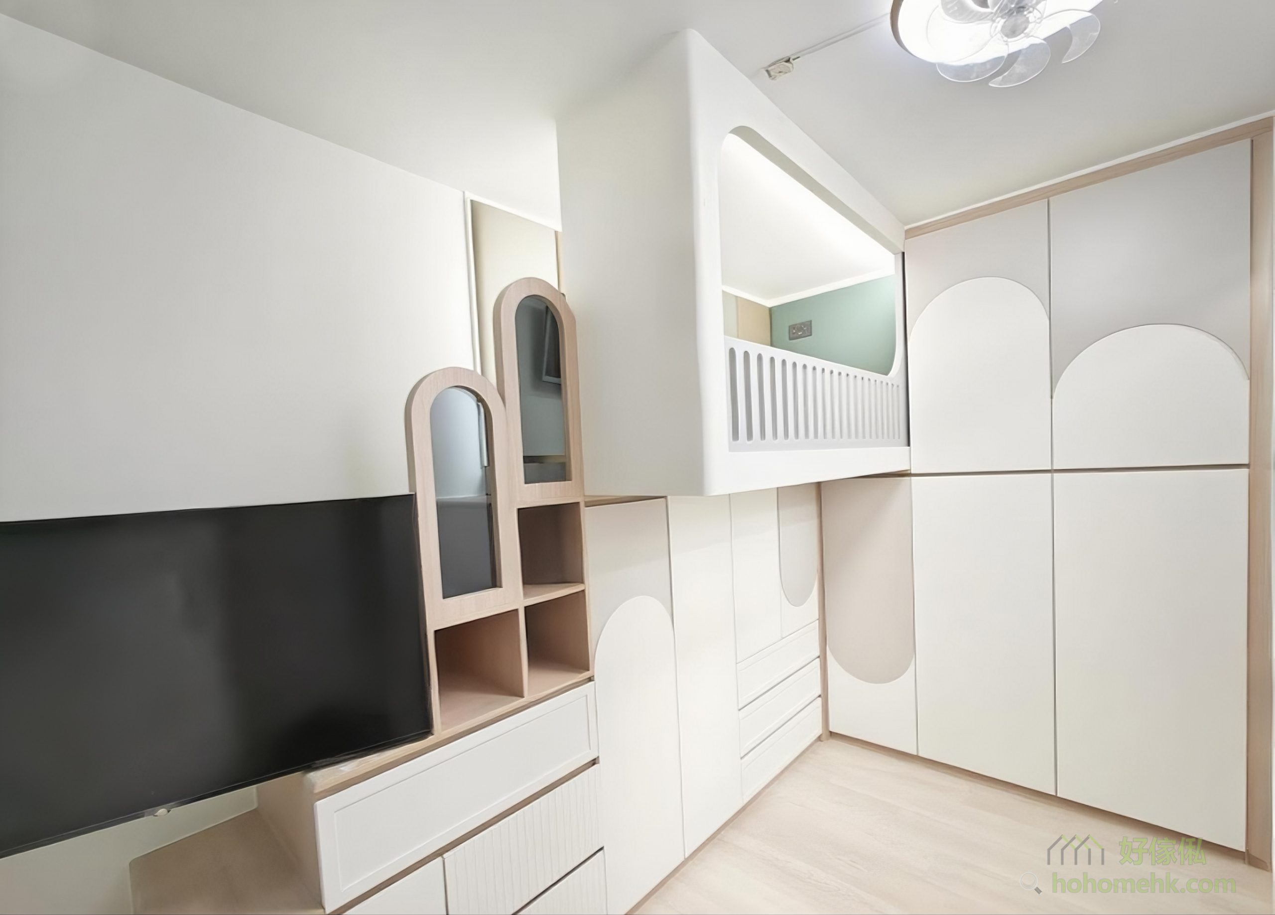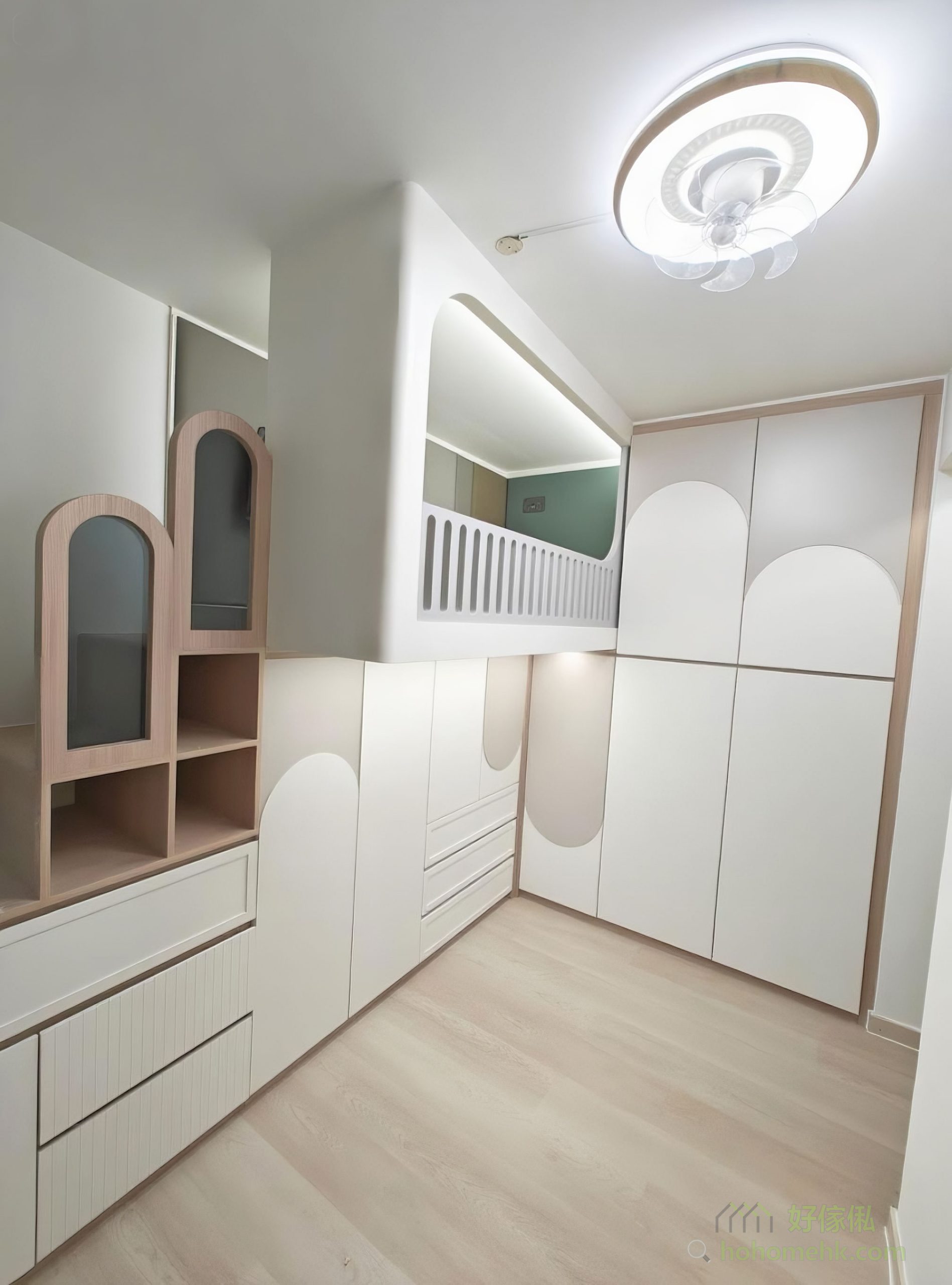 This loft bed pays special attention to details and adopts an arc-shaped cabinet door design, creating a soft visual effect and making the overall space more warm and cozy. The cabinet body is mainly colored in white and wood grain, which is simple and natural, while enhancing the brightness of the space. The residents are very satisfied with the design, saying that the new furniture has greatly improved the quality of life and they are brimming with happiness.
