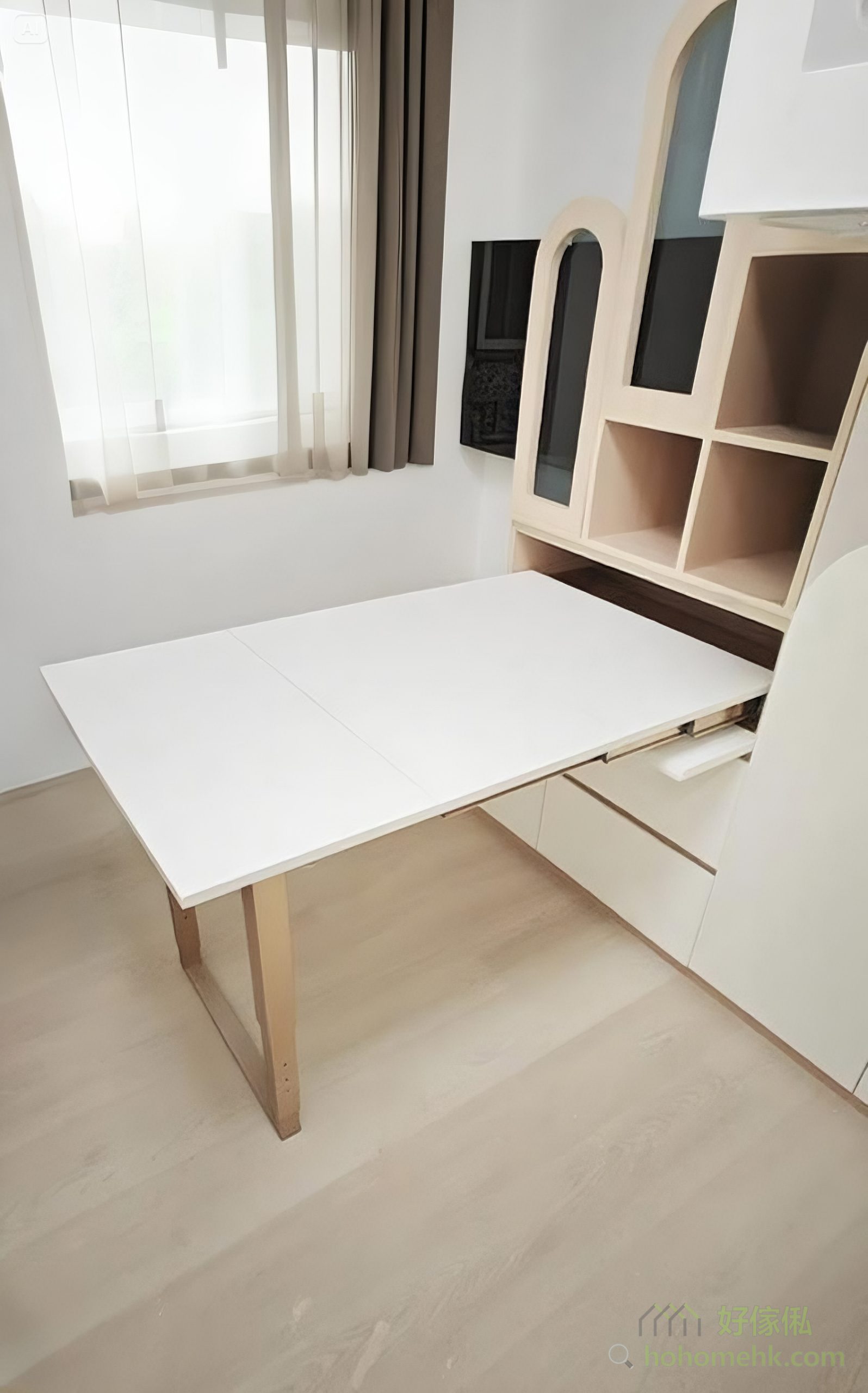The wardrobe on the lower level not only has sufficient capacity but also is equipped with touch-controlled light strips, making it convenient for customers to take their items at any time. The storage cabinet on the other side is also very practical in design, capable of storing daily sundries and keeping the space tidy. In addition, the highlight design of the hidden dining table can be unfolded in just 10 seconds, making it an ideal desktop for dining or working. This flexible functional configuration enables small units to enjoy the convenience of large Spaces.
