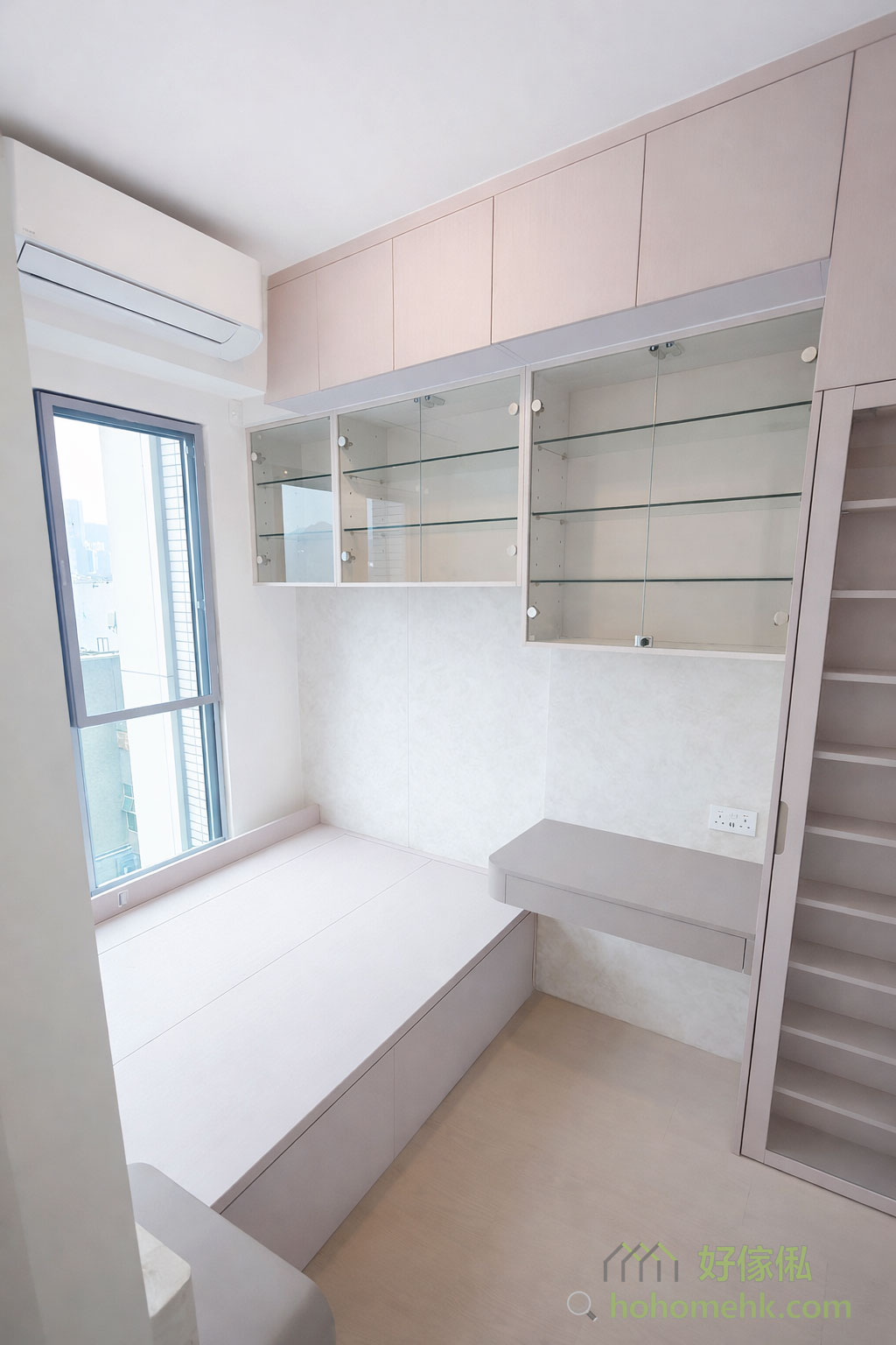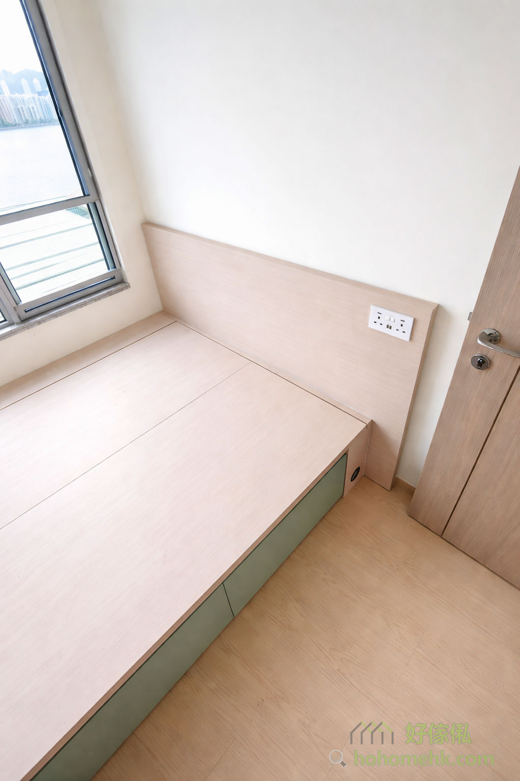 The hydraulic bed design makes full use of the limited floor space, providing a large amount of hidden storage space, keeping the room tidy while maintaining a sense of comfort. The combination of the lake green under-bed cabinet bucket and the white wood-grain platform is harmonious and natural, adding a touch of soft beauty to the room.