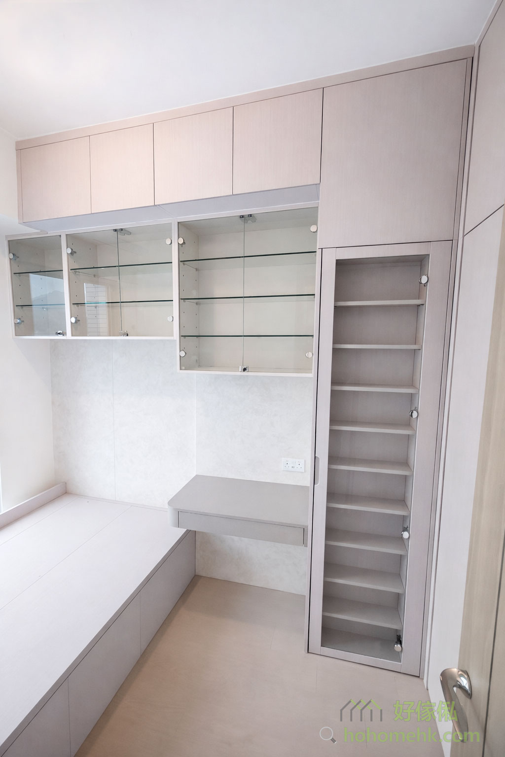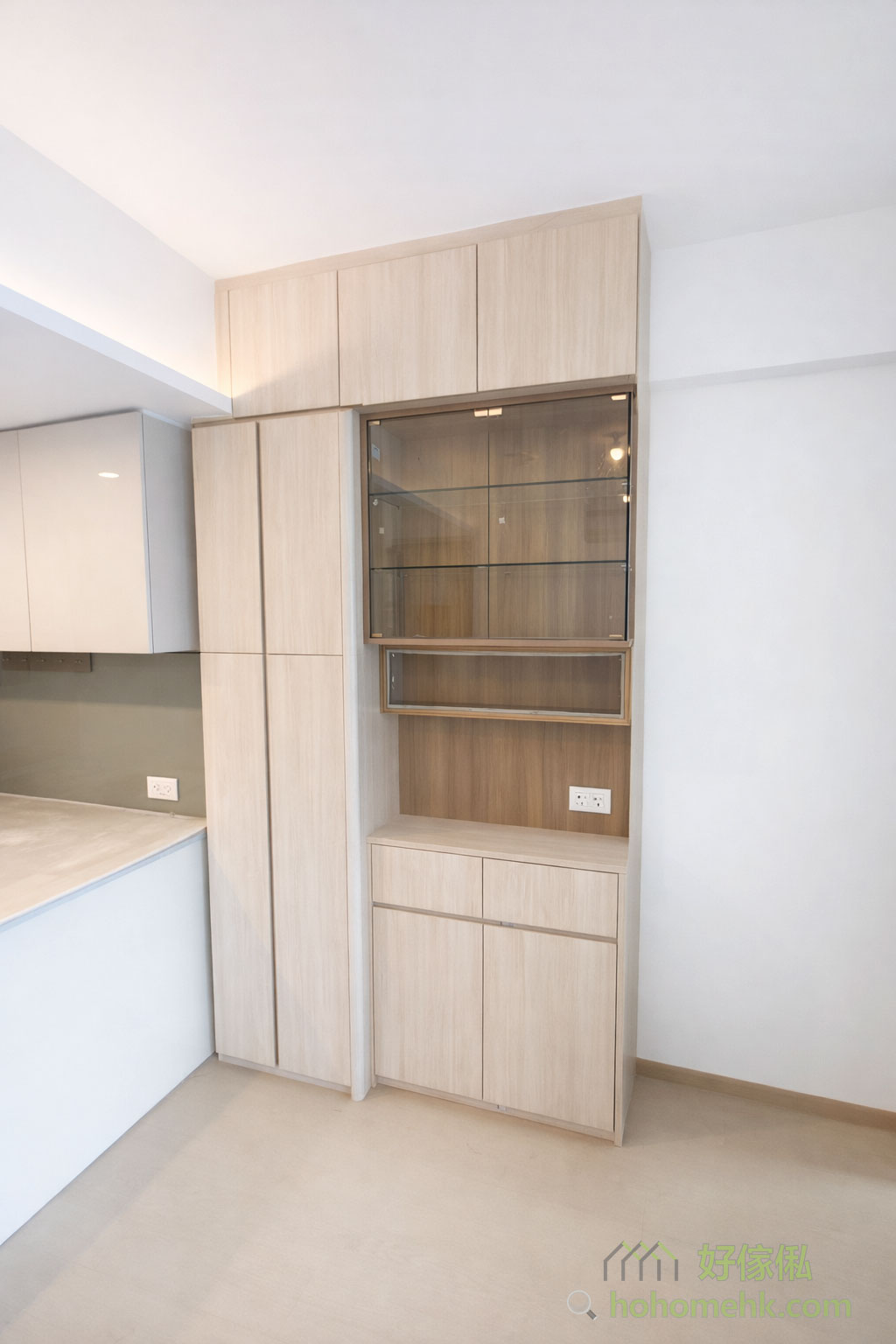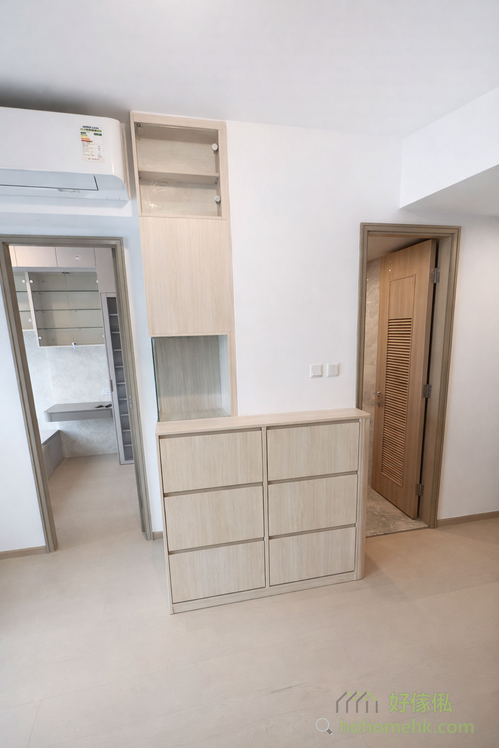 The glass door design of the hall cabinets and room cabinets not only enhances the sense of transparency in the space but also effectively reflects natural light, making the entire interior appear more spacious and bright. This delicate design approach not only enhances the practicality of the home but also brings a modern and simple sense of fashion, providing a more comfortable living experience for small-unit residents.