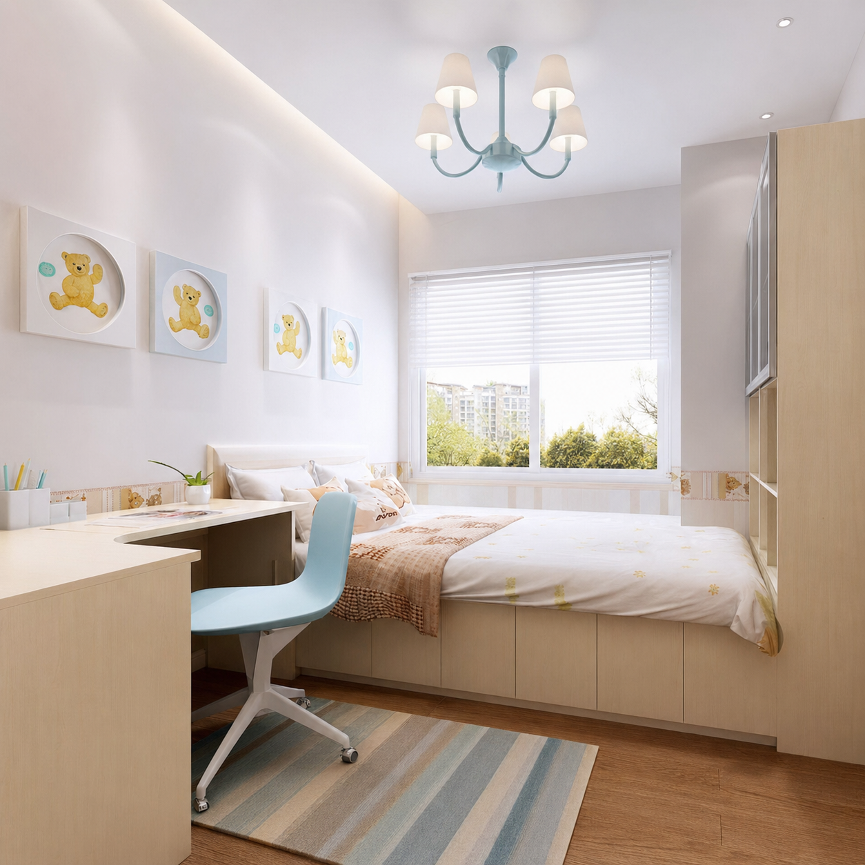 The design uses a transparent frost-glass door to create a room in the hall, and two more doors to create two rooms in the entrance. The top of the door between the two rooms is made of movable transom, so that the cold air from the window air conditioner installed beside the window can be blown into the two rooms. We have made different size floor beds in each room to greatly increase the storage space of the estate. The large room and the room inside also use double-sided wardrobes as a separation, half of which are used than the large room of the hall, and the other half is used on the side.
