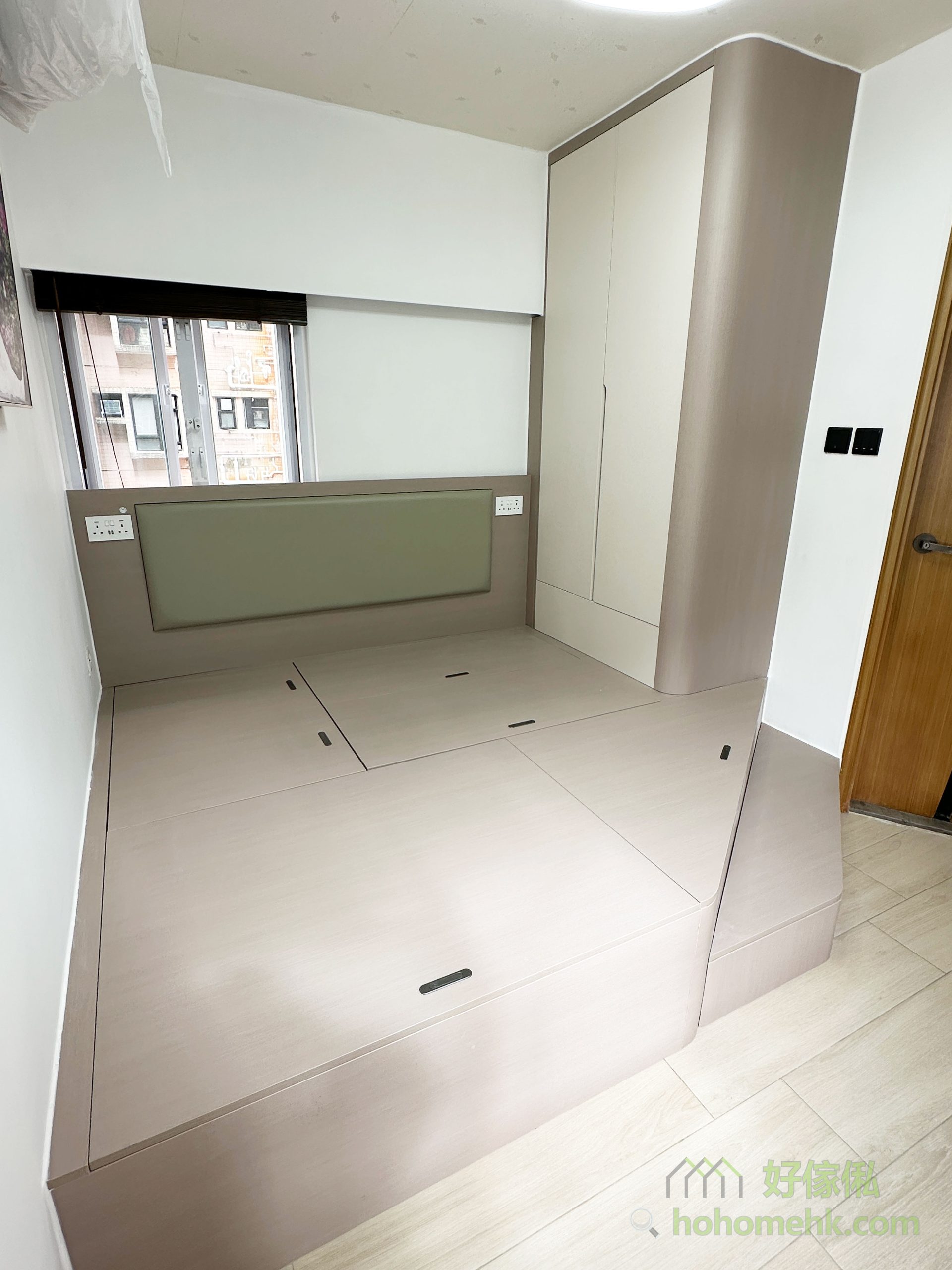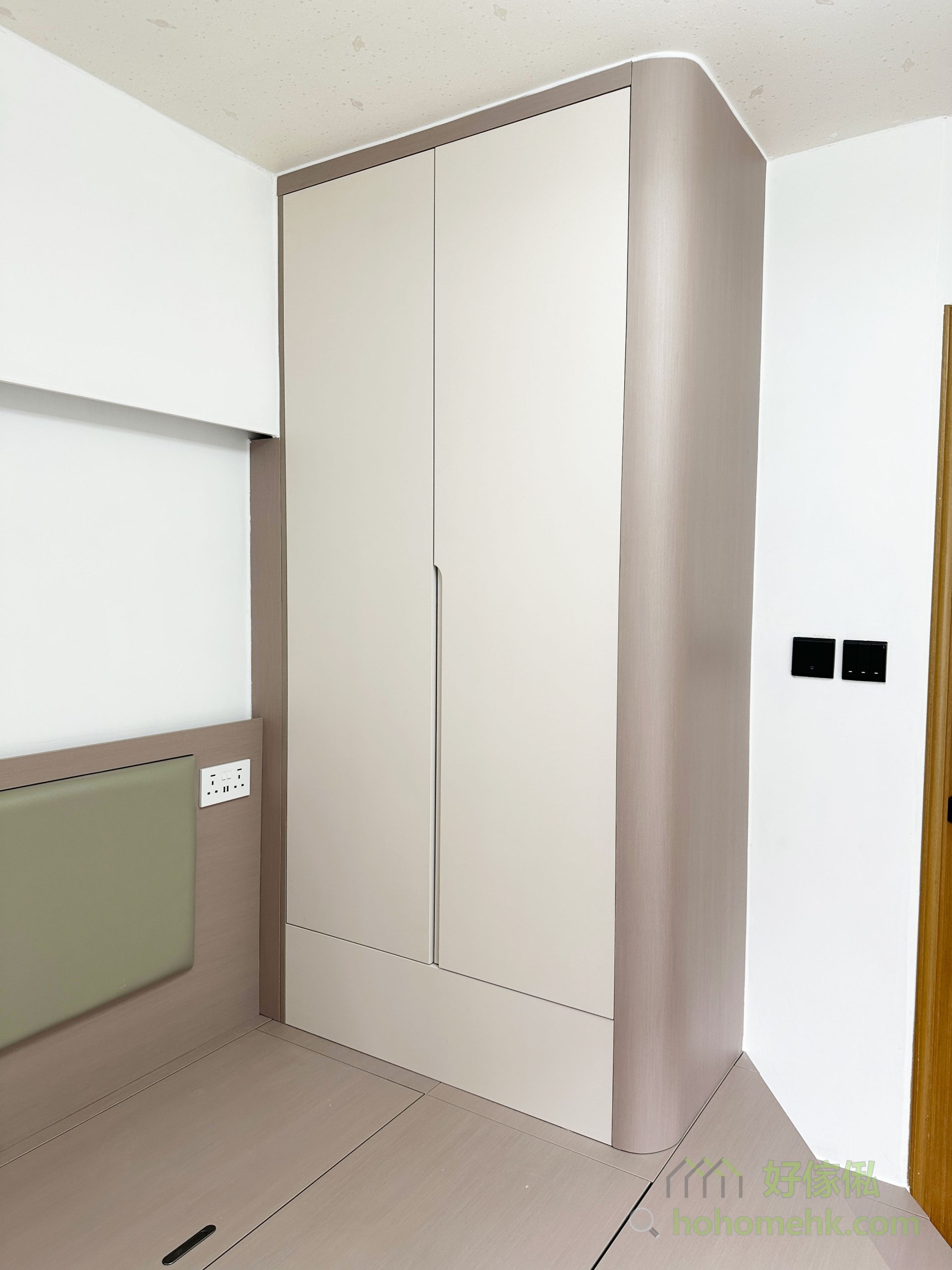 The design focus of the master bedroom lies in the position of the ensuite bathroom door. A specially designed sloping platform was created to avoid inconvenience when entering and exiting the toilet. In addition, the khaki platform bed and the round-edge wardrobe complement each other, not only enhancing safety but also adding a sense of warmth to the living space. The design of the green soft cushion at the head of the bed adds a touch of soft color to the overall space.The design focus of the master bedroom lies in the position of the ensuite bathroom door. A specially designed sloping platform was created to avoid inconvenience when entering and exiting the toilet. In addition, the khaki platform bed and the round-edge wardrobe complement each other, not only enhancing safety but also adding a sense of warmth to the living space. The design of the green soft cushion at the head of the bed adds a touch of soft color to the overall space.