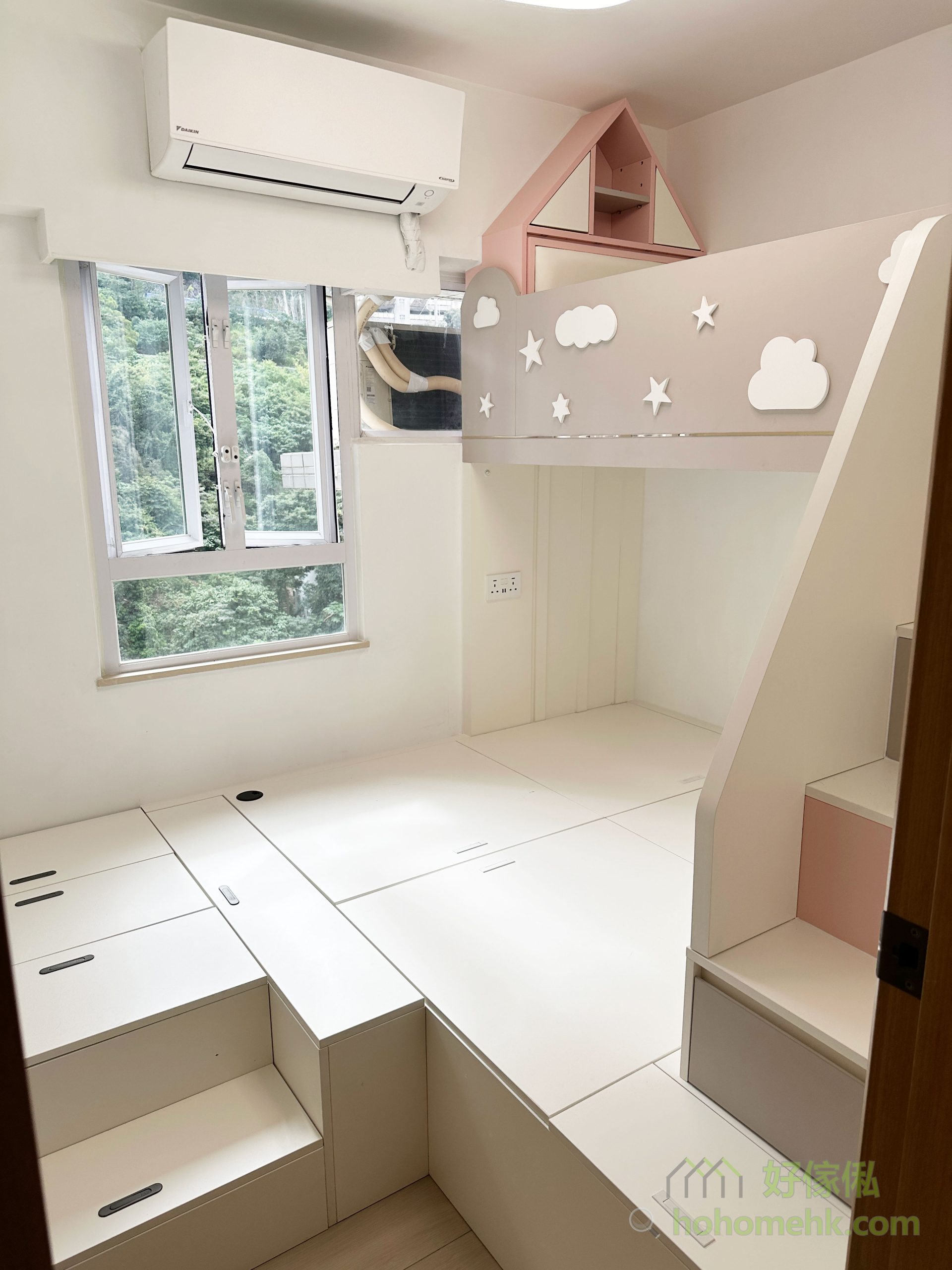 The design of the children’s room fully takes into account the flexibility and functionality of small Spaces. The entire floor platform provides ample storage space, while the staircase cabinet also serves as a bedside table for the lower bed, enhancing the overall practicality. The fence decoration of the upper bed is themed around stars and white clouds, which is not only beautiful and attractive but also adds a touch of childlike fun. Each step of the staircase is custom-made according to the height of the child. After getting into the bed, there is a bedside table in the shape of a house, equipped with a triangular roof storage space, fully demonstrating the potential of creative design and meeting the child’s desire for “exclusives” Imagination of “space”.The design of the children’s room fully takes into account the flexibility and functionality of small Spaces. The entire floor platform provides ample storage space, while the staircase cabinet also serves as a bedside table for the lower bed, enhancing the overall practicality. The fence decoration on the upper bed is themed around stars and white clouds, which is not only beautiful and attractive but also adds a touch of childlike fun.