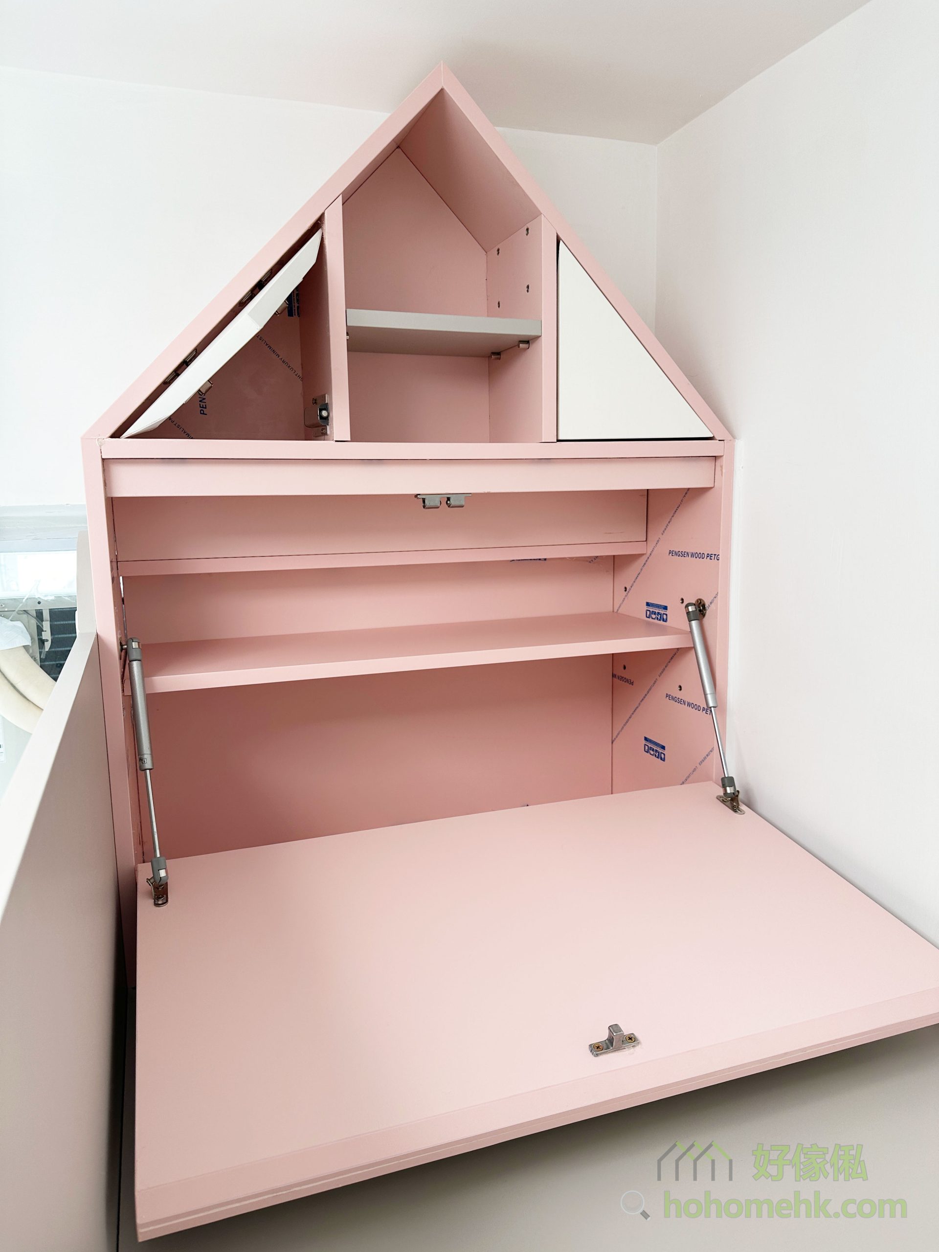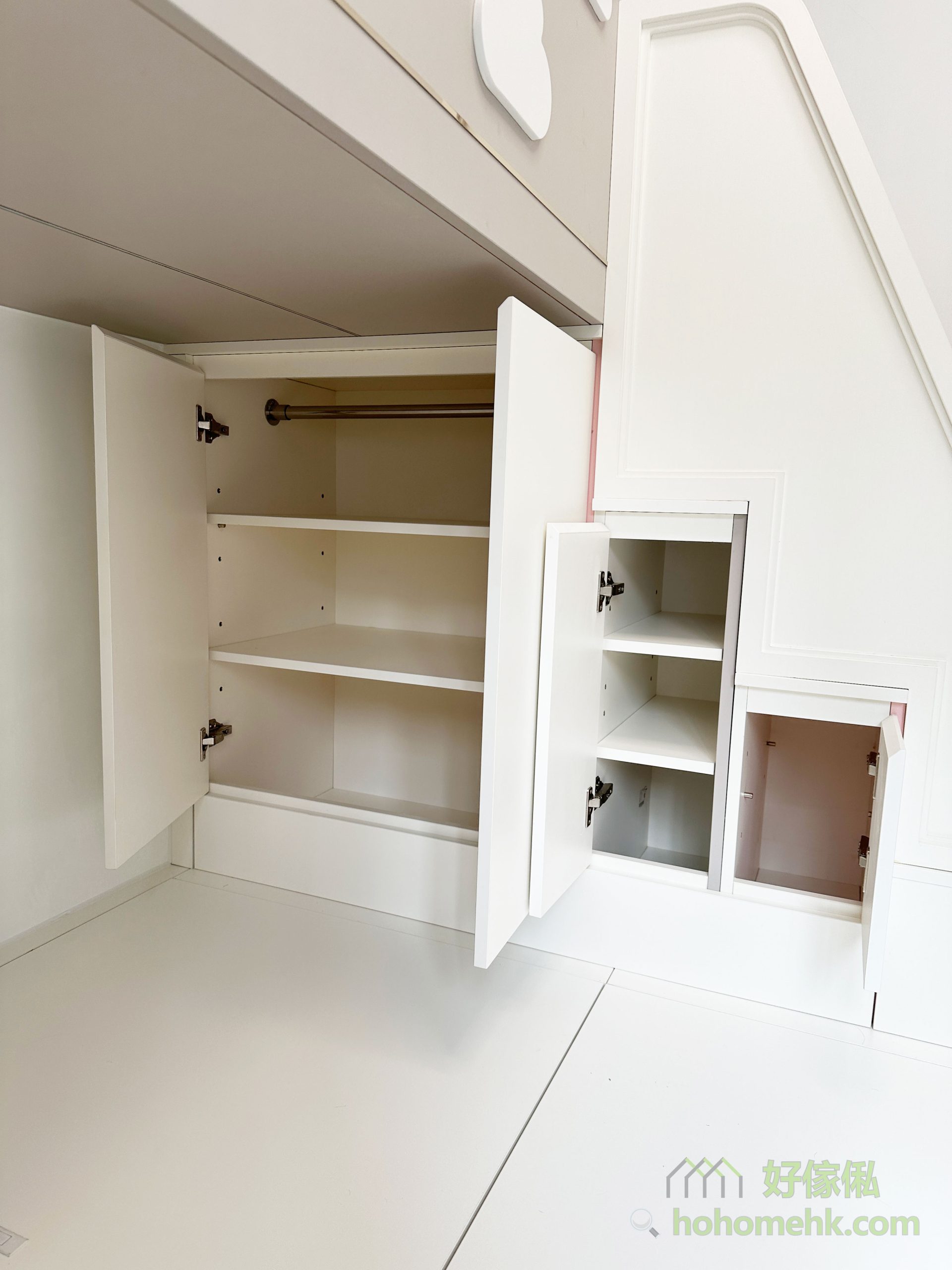 The design of the children’s room fully takes into account the flexibility and functionality of small Spaces. The entire floor platform provides ample storage space, while the staircase cabinet also serves as a bedside table for the lower bed, enhancing the overall practicality. The fence decoration on the upper bed is themed around stars and white clouds, which is not only beautiful and attractive but also adds a touch of childlike fun.Each step of the staircase is custom-made according to the height of the child. After getting into bed, there is a bedside table in the shape of a house, equipped with a triangular roof storage space, fully demonstrating the potential of creative design and fulfilling the child’s imagination of a “private space”.