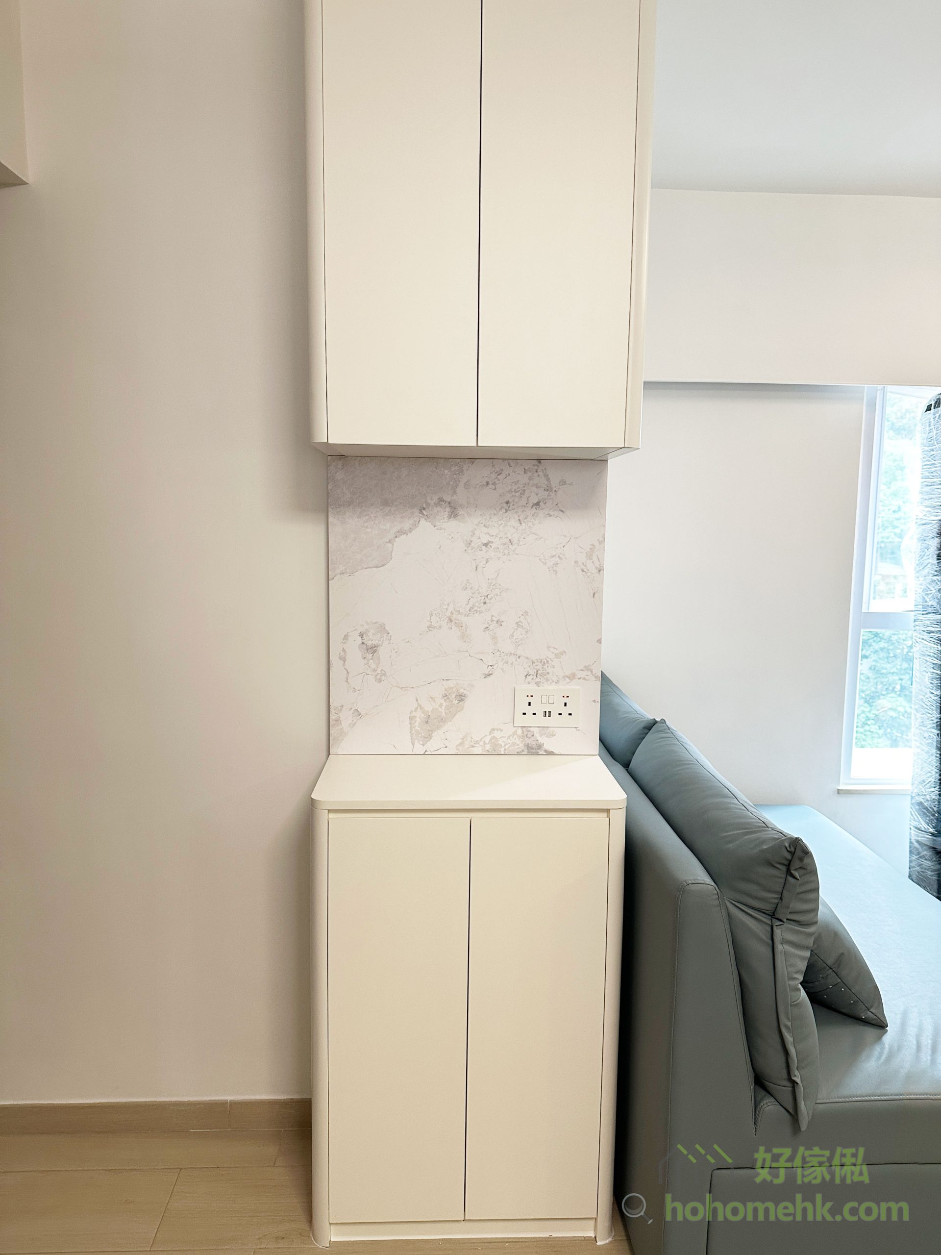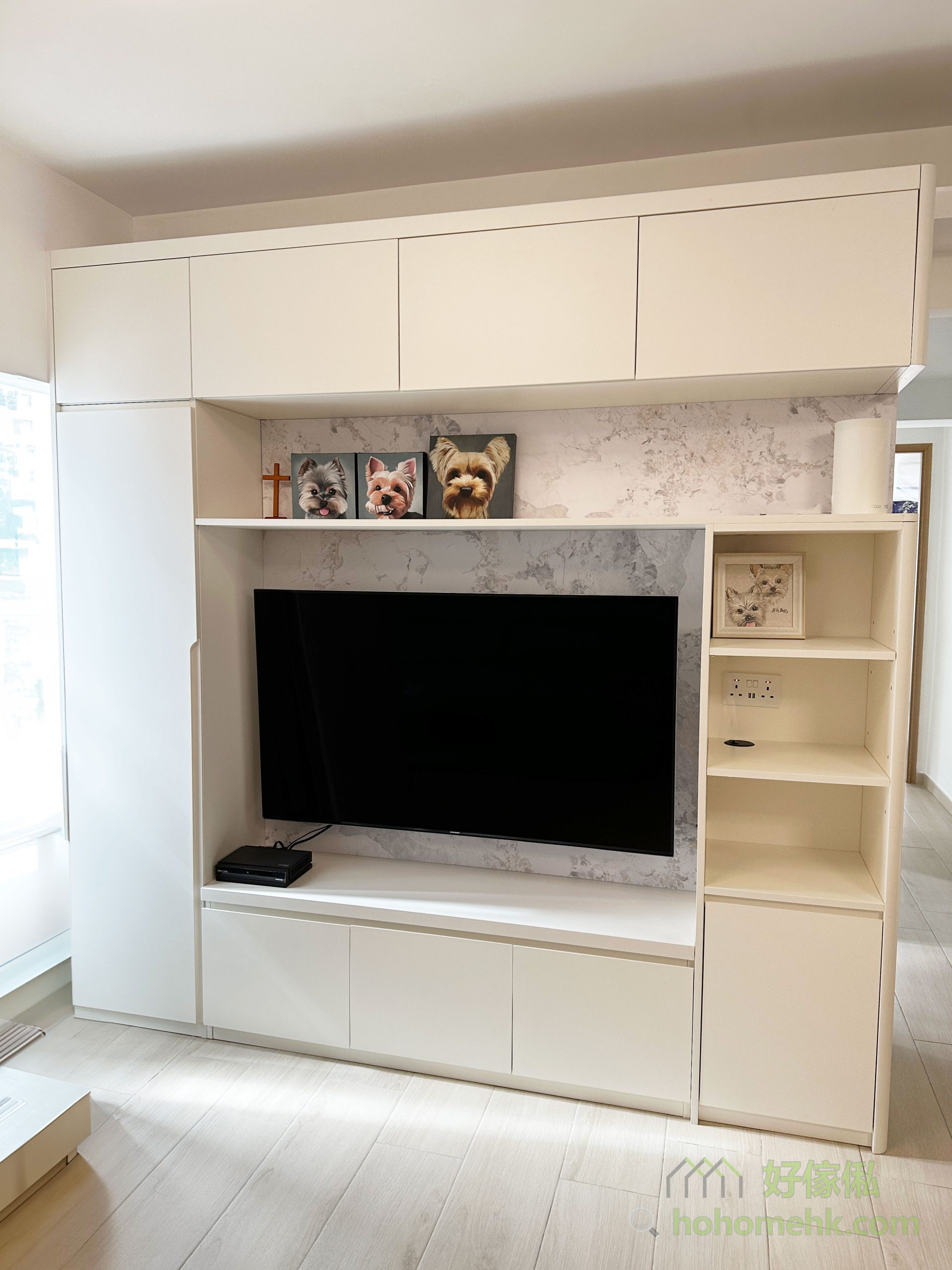 As soon as you enter the living room, the C-shaped cabinet becomes the highlight of the entrance. It is not only practical but also maintains the tidiness of the door. Moreover, it can extend the wall where the sofa is placed. The focal point of the living room is the 7-foot-long TV cabinet, which uses cream white as the main color for the cabinet body and door, combined with simple lines, creating a light and airy visual effect. Although the TV cabinet is relatively large in size, its overall design is not at all cumbersome and blends perfectly into the living room space.As soon as you enter the living room, the C-shaped cabinet becomes the highlight of the entrance. It is not only practical but also maintains the tidiness of the door. Moreover, it can extend the wall where the sofa is placed.