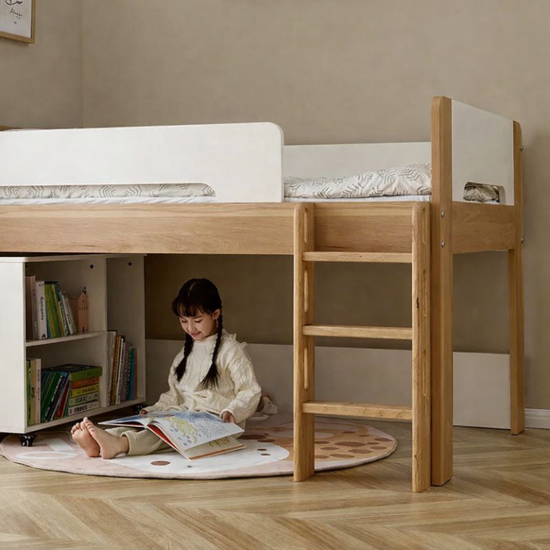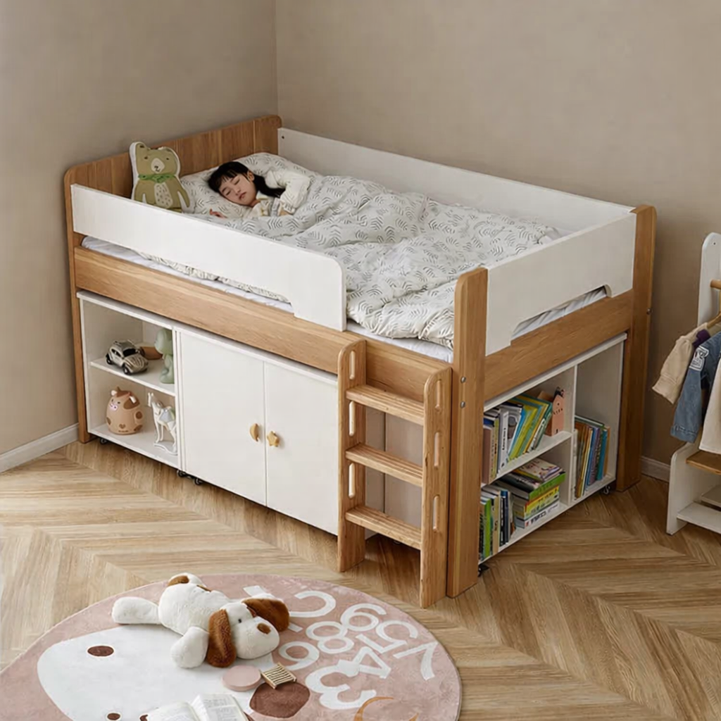 Under the bed, there is a dust-proof wardrobe, a storage cabinet and an open bookshelf. Shirts, toys and books all have a place to be placed, which is neat and easy to carry. There's no need to buy another cabinet. It saves space and money, making it perfect for families who want something simple yet practical.
